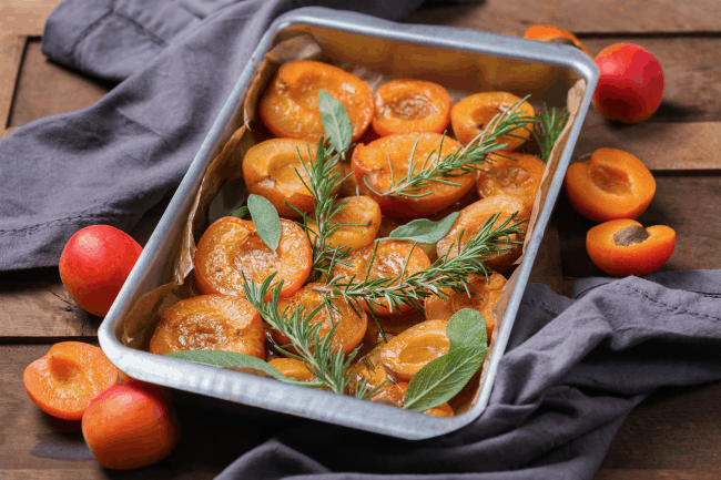 Malzemeler: 10 adet iri kayısı 2 yemek kaşığı bal 1 yemek kaşığı tereyağı Adaçayı ve biberiye yaprakları Hazırlanışı: Kayısıları yıkayıp ortadan ikiye kesin ve çekirdeklerini çıkarın. Bir fırın tepsisine yağlı kağıt serin, kayısıları çekirdeği çıkarılmış kısımları yukarı gelecek şekilde tepsiye dizin. Üzerine balı bir kaşık yardımıyla gezdirin. Buzdolabından çıkardığınız tereyağını fındık kadar küçük parçalara…