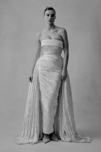 Floure, straplez bir elbise üzerinde, kalem etekli ve çıkarılabilir bir üst etekle birlikte, tüm gelinliği kaplayan mikro pileler sundu. Enaura, A-line bir elbise üzerinde, heykelsi drapeler ve kıvrımlarla pilelere dramatik bir yaklaşım sergiledi.