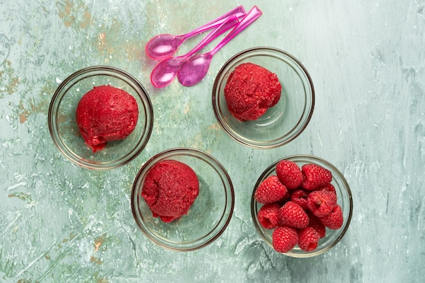 Dondurma ve Servis Ahududu karışımını bir kaba yayın. Üzerini kapatın ve yaklaşık 4 saat veya katılaşana kadar dondurun. Karışımı bir çatalla parçalayın; gerekirse yarısını mutfak robotuna veya blendera koyun, 60 saniye boyunca veya pürüzsüz ve rengi açılana kadar karıştırın.