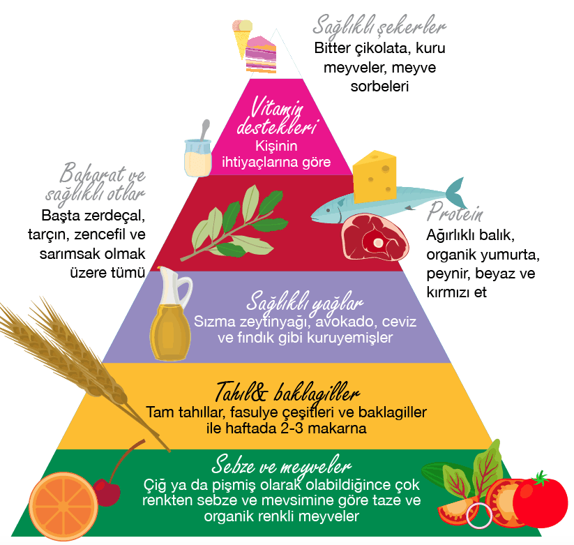 İnflamasyonla mücadelede en önemli adımlardan biri, yağ dengesi… Burada anahtar her gün doymamış ve doymuş yağ dengesini dengeli tüketebilmek. Beslenme piramidinin üçüncü basamağında yer alan sağlıklı yağlarda, soğuk pres zeytinyağı gibi yağların tüketilmesi öneriliyor. Avokado, ceviz, fındıktan da sağlıklı yağ almak mümkün