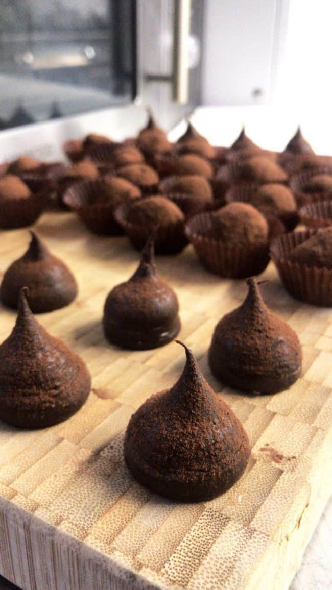 3 adet kakuleyi kabuklarından ayırıp içindeki tanelerini havanda ezin ve 100 gr. çiğ kremayla birlikte ocakta ısıtın, ardından ocağı kapatın. 200 gr. bitter çikolatayı (%54 kakao) elinizle parçalayıp ısıttığınız kremanın içine ekleyin ve karıştırarak eritin.1 yemek kaşığı tereyağını ilave edin. Oda ısısında veya buzdolabında soğumaya bırakın. Elle şekil verilebilecek kıvama geldiğinde yuvarlayıp tepsiye dizin. 5…
