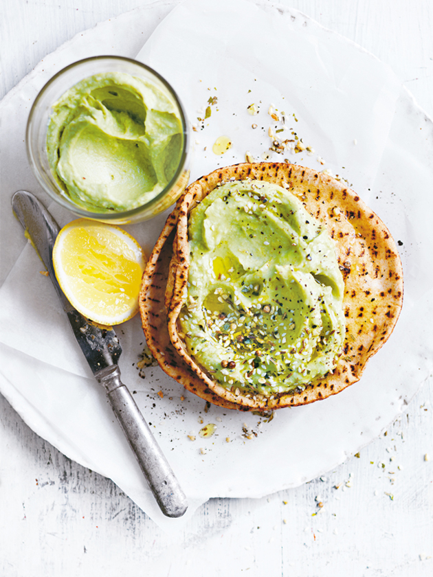 Avokado humusunu her bir lavaşın ya da ortadan kestiğiniz bazlama ekmeğinin üzerine kaşıkla koyun, üzerine dukkah serpin ve yağ gezdirin. Limon dilimleri ile servis edin.