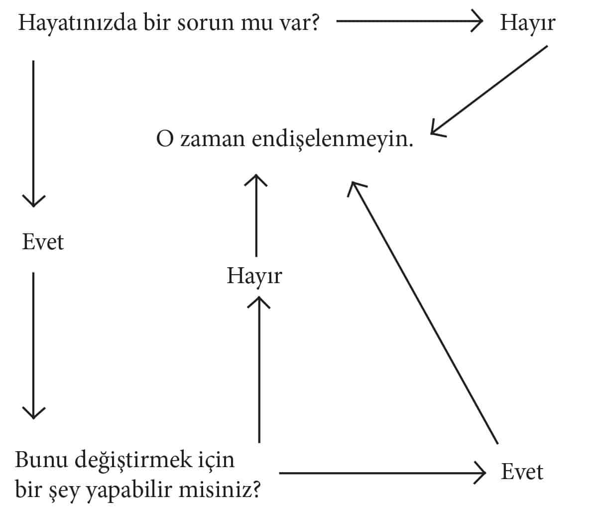 Günlük hayatın koşuşturması, iş dünyasındaki sıkıntılar, aile hayatındaki sorunlar, trafik, stres derken hepimiz bazen kendimizi bir endişe yumağının ortasında buluyoruz. Halbuki endişenin üstesinden gelmenin çok basit bir formülü var. Yapmanız gereken tek şey düşünce yapınızı değiştirmek… Hemen şimdi denemeye başlayın. Örneğin yakın zamanda ya da mevcut anda sizi endişelendiren bir durumu düşünün. Ardından aşağıdaki akışı takip ederek vardığınız noktayı fark edin.