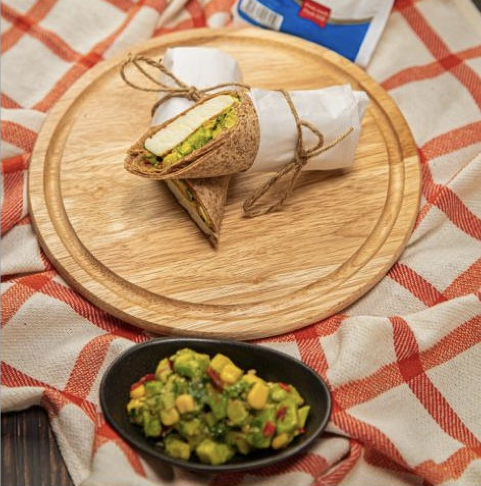 - Hazırladığımız avokado salsayı, tortillanın bir yüzüne yayalım. Üzerine kızarttığımız hellimleri dizelim.