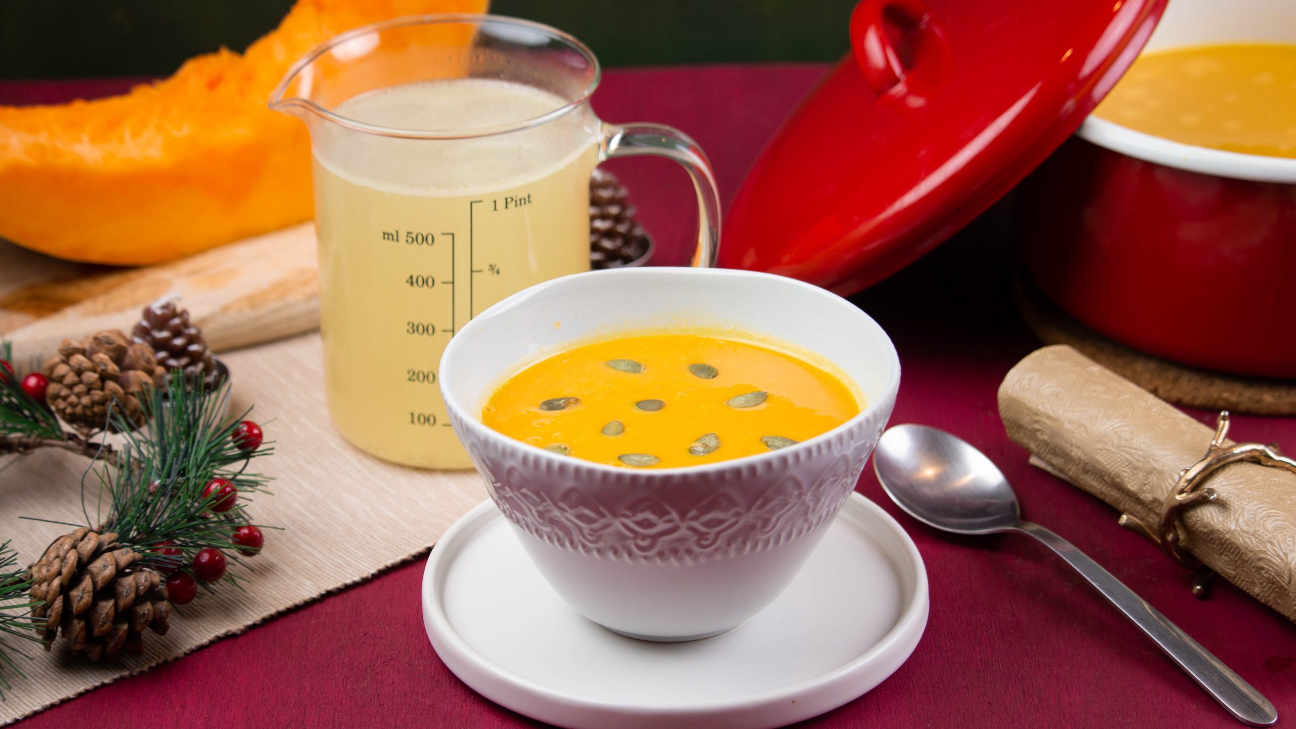 - Soğan ve balkabaklarını tereyağında kavurun. Ardından et suyunu ekleyip pişmeye bırakın. Piştikten sonra robottan çekip baharatını ekleyebilirsiniz.
