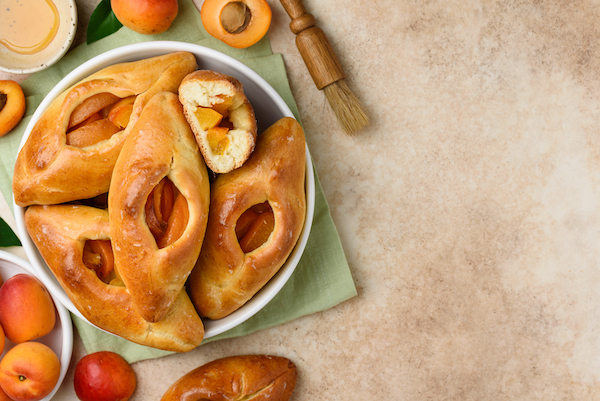 Bu sırada Piroshki’nin iç harcı için kayısıları ikiye bölüp çekirdeklerini çıkarın. Büyüklüklerine göre kayısıları küçük dilimlere kesin. Dinlenen hamurdan fotoğraftaki Piroshki’lerin büyüklüğünde parçalar koparın. Unladığınız tezgah üzerinde elinizle dikdörtgen şekil verin. Hamurun ortasına biraz kayısı marmeladı sürün, üzerine dilimlediniz kayısılardan yerleştirin. Ortası açık kalacak şekilde uçlarından ve yanlarından hamuru kayısıların ortasına doğru kapatın. Bir adet yumurtanın sarısını çırpıp hamurların kenarlarına sürün.