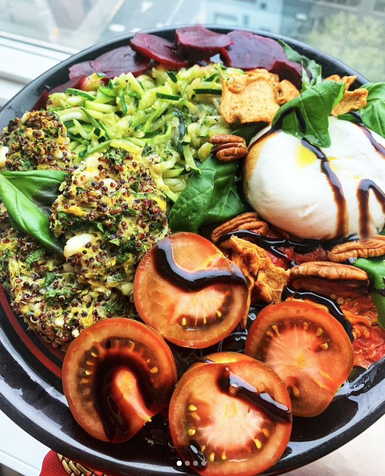 Kinoa köfte nereden geldi aklıma? Çok da basit ve hızlıymış yapması, Google’a yazınca onlarca tarif karşınızda. Kinoa köftelerimi naneli süzme yoğurt ile tamamlamaktansa, baktım evde kabak noodle ve burrata var. Bir de pancar ve domates doğradık mı doldurduk tabağı! Tatlı olarak da ev yapımı çilekli limonlu sorbe.