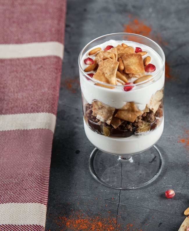 - Cam bir kaseye sırayla labneli sos, patlıcan, kavrulmuş kıyma ve kızarmış lavaşları yerleş