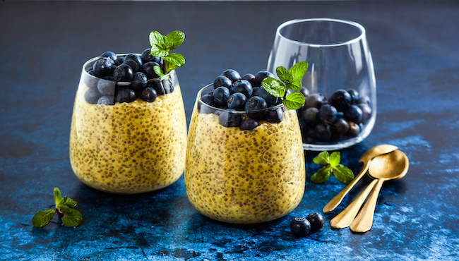 Püre haline gelen mangoya chialı karışımı ekleyin. Servis yapacağınız kuplara alın, yaban mersini ve nane yapraklarıyla süsleyin.