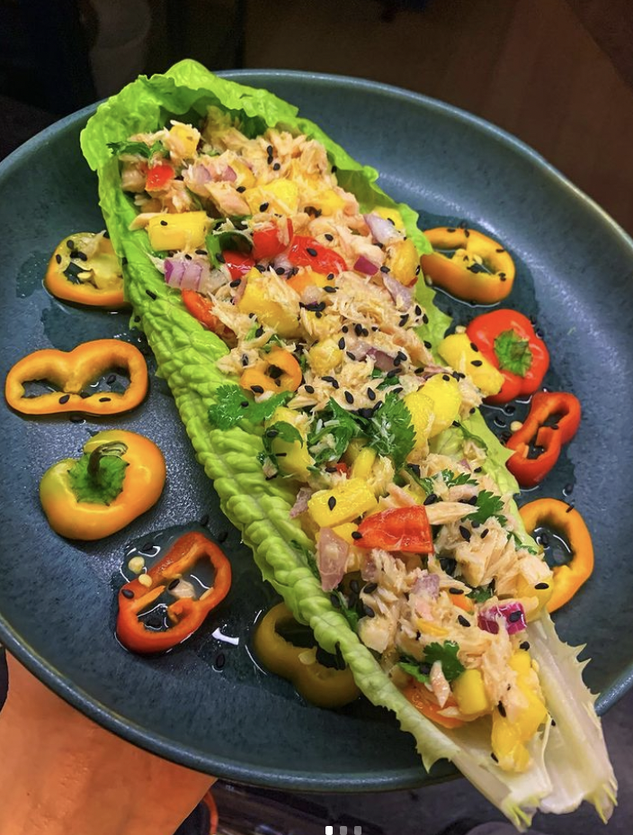 Geçen gün yaptığım ceviche’den arta kalan malzemeleri kullandım esasında. Bir kasede ton balığı mor soğan, renkli biberler, kişniş ve mangoyu zeytinyağı, limon suyu, misket limonu suyu, tuz, karabiber, kekik, susam ve hindistan cevizi tozuyla karıştırdım. Buzdolabında yarım saat kadar beklettim. Daha sonra büyükçe bir marul diliminin içine yayıp servis ettim.