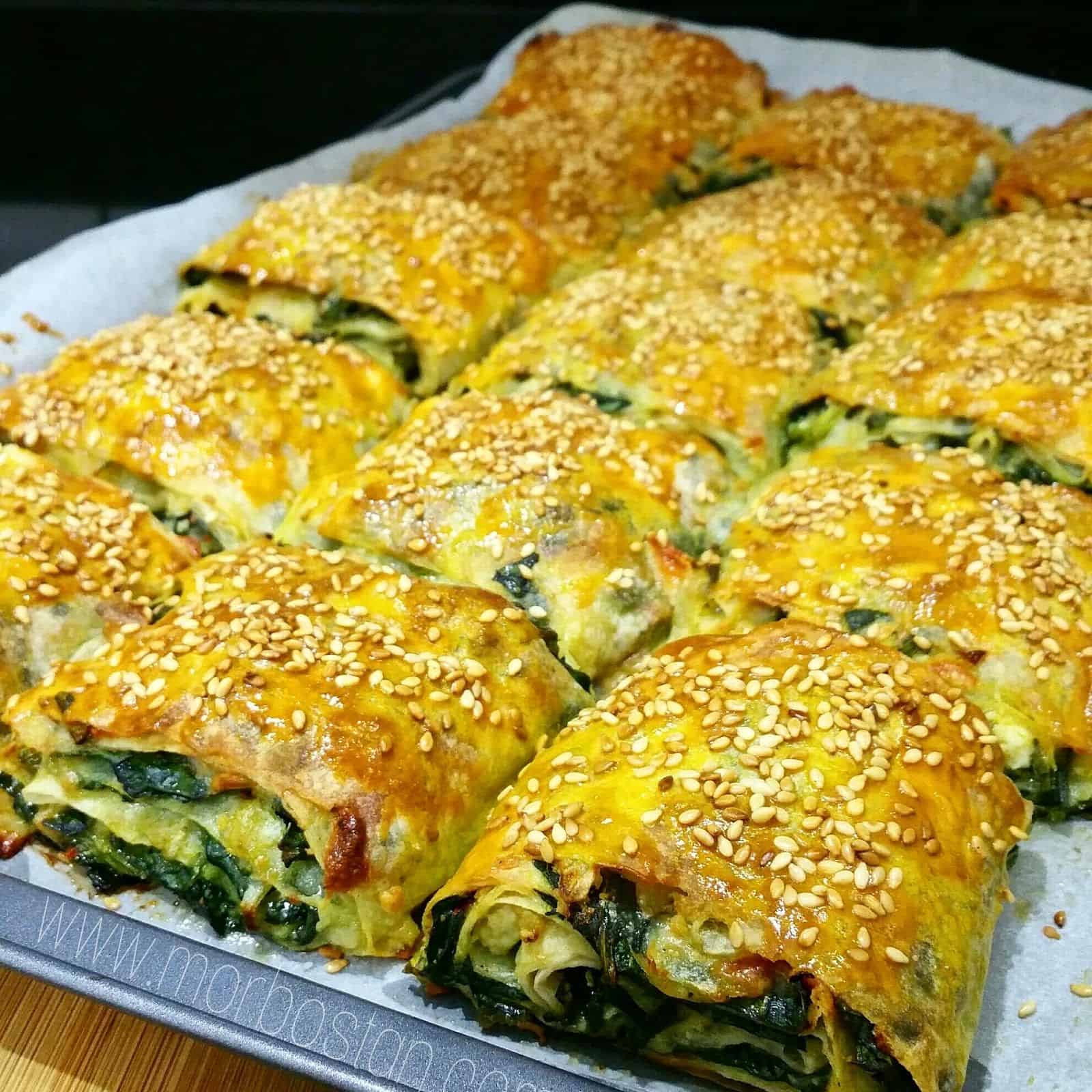 Yufkalara sürmek için sıvı yağ ve sirkeyi karıştırın. Tepsiye ilk yufkayı serip üzerine yağlı ve sirkeli karışımı sürün. Aynı şekilde 2. Kat yufkayı da yayıp karışımı iyice üzerine yayın. Ispanaklı harcın yarısını elinizle dağıtarak yufkanın üzerine yerleştirin. İki adet yufkayı da aynı şekilde üst üste yayın. Kalan ıspanaklı harcı üzerine yerleştirin. Son kat yufkayı da en üste yayın. Üzerine ayırdığınız 1 adet yumurtanın sarısını hafif suyla açıp sürün. Böreği dilimler halinde kesip önceden 200 derecede ısıtılmış fırında pişirin.