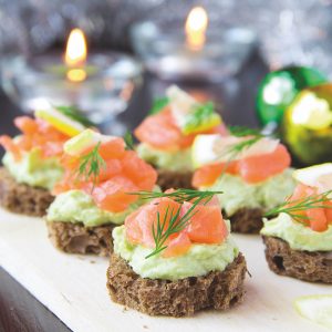 Avokadoyu ikiye kesip çekirdeğini çıkarın ve kabuklarını soyun. İnce kıyılmış sarımsak, limon suyu ve zeytinyağı ile karıştırıp ezerek püre haline getirin. İsterseniz tuz ilave edebilirsiniz. Tam tahıllı ekmeği önce dilim halinde kesin. Sonra yuvarlak bir kalıp yardımıyla yuvarlaklar çıkarın. Üzerine önce hazırladığınız avokado püresini sonra somon fümeleri yerleştirin. Dereotu ve ince limon dilimleri ile süsleyerek servis yapın.