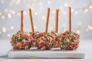 Peynirleri bir kaseye alın. Kırmızı biberi de ekleyerek elinizle homojen bir kıvam alana kadar yoğurun sonra küçük toplar halinde yuvarlayın. Pastırmaları küçük parçalar halinde kesin, orta ateşteki tavada hafif terletin. Ceviz içlerini küçük parçalar haline gelecek şekilde robottan çekin. Maydanoz yapraklarını ince kıyın. Pastırmaları, ceviz içlerini ve kıydığınız maydanozları ayrı tabaklara alın. Peynir toplarını önce pastırmaya sonra ceviz içine en son da maydanoza bulayın.Topların üzerine birer adet çubuk krakeri kürdan gibi yerleştirerek servis tabağına alın.