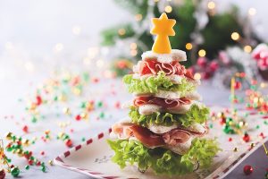 Dilimli ekmeği yıldız şeklindeki bir kalıp yardımıyla kesin. Farklı büyüklükte kalıplar kullanarak istediğiniz çam ağacı formunu daha kolay yakalayabilirsiniz. Ekmek dilimlerinin arasına bir sıra marul yaprağı bir sıra dana jambon yerleştirerek istediğiniz yükseklikte bir çam ağacı yapın. Çamın üzerine yine kalıp yardımıyla chedar peynirinden -kaşar peyniri de kullanabilirsiniz- kesip yerleştirin.