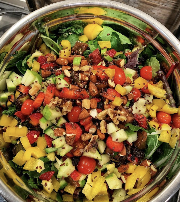 Salataya koymak için Brüksel lahanası ve tatlı patates pişirdik. Gerçi o sırada açgözlülüğümüz tutmuş, bir baktık fazla geldi salataya… Ondan kalanını tavuğumuzun yanında servis ettik. Salatamızı roka, ıspanak, fesleğen gibi farklı yeşillikleri bir araya getirerek hazırladık. İçine ise sarı biber, cherry domates, salatalık, yeşil elma, çilek, ceviz, badem, kuru üzüm ve keten tohumu koyduk.