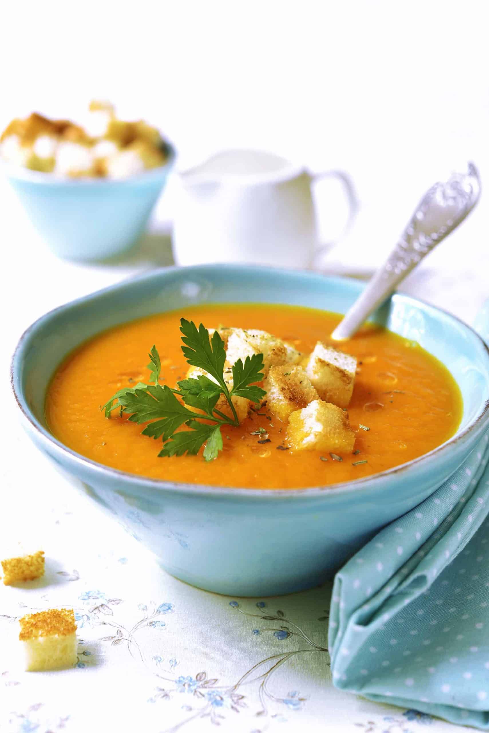 Balkabağı, patates, soğan, havuç ve zencefili doğrayın. Bir tencereye zeytinyağı koyun, tüm sebzeleri ekleyip birkaç dakika soteleyin. Tencereye su ilave edin ve sebzeleri haşlayın. Bir kapta yumurta sarısı, un ve sütü çırpın. Sürekli karıştırarak azar azar sebzelere ekleyin ve 5 dakika daha pişirin. Tuz ve biber ekip karıştırın ve ocağı kapatın. Çorbayı blender’dan geçirin. Kaselere koyduktan sonra maydanoz ve krutonla servis yapın.